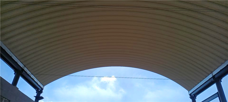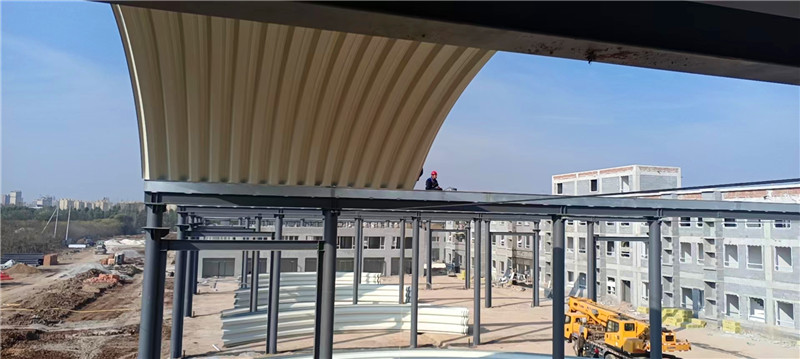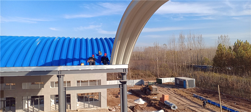 屋頂采用的板材為TS280GD-Z高強度鍍鋅鋼板,厚度1.0mm,寬度914mm,具備良好的抗腐蝕性與強度。結構設計按照矢跨比0.2進行合理拱形設計,有效提高了屋面的排水能力和抗風能力。