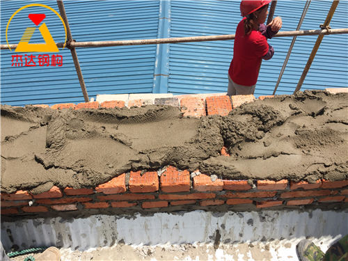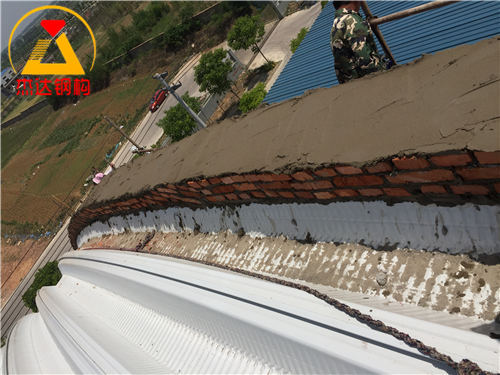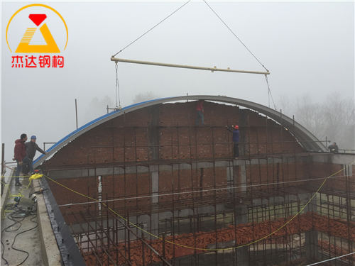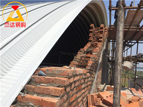 拱形屋頂?shù)拇u混結(jié)構(gòu)山墻施工需要土建施工單位和拱形屋頂施工單位的緊密配合。施工過(guò)程中,設(shè)計(jì)拱高尺寸由拱形屋頂施工方提供,土建單位據(jù)此預(yù)留足夠高度以便后續(xù)安裝,保障整體施工質(zhì)量與進(jìn)度。