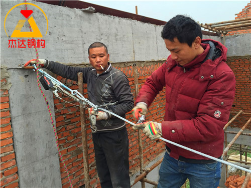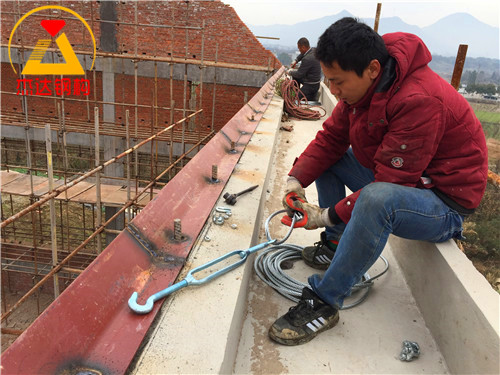 拱形屋頂?shù)拇u墻上口以及全鋼結構的鋼柱頂部通常會安裝拉鋼絲繩,以增強結構的受力能力。鋼絲繩一般選用M12M14規(guī)格,既能滿足承載需求,也保證了耐久性。