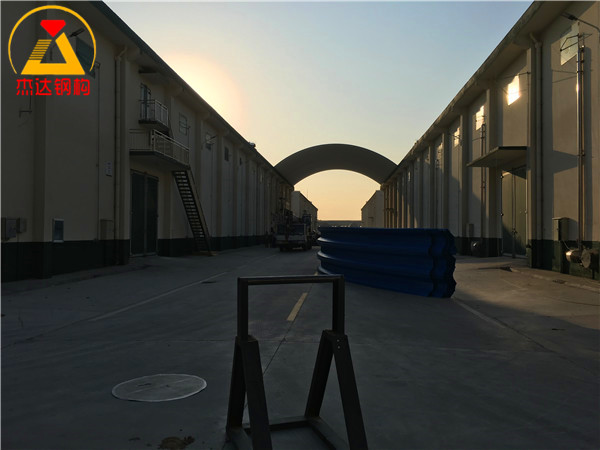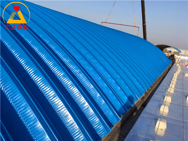 該拱形屋頂跨度17.9米,長度856米,總建筑面積為1521.5平方米。施工中使用1.0mm厚的高強(qiáng)彩涂卷材,結(jié)合焊接托板,實(shí)現(xiàn)了矢跨比為0.2的穩(wěn)定拱形結(jié)構(gòu)。