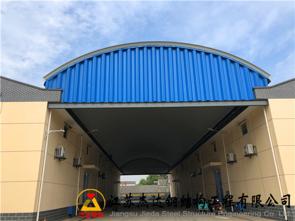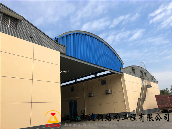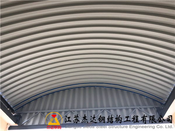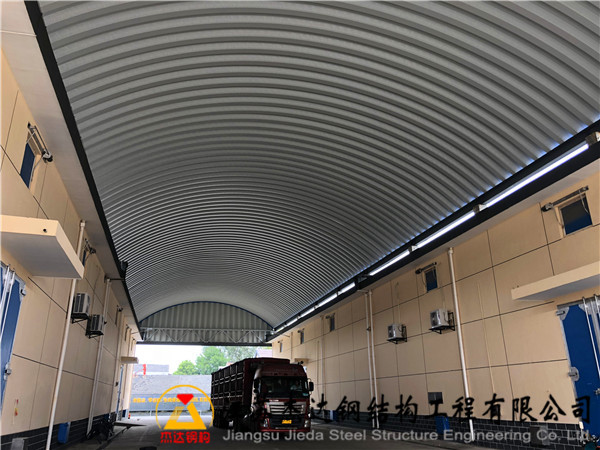 該項目位于江蘇省南京市浦口區(qū)糧食儲備庫內,罩棚跨度達16米,長度60米,采用拱形波紋鋼屋蓋結構。結構兩側設有250*250H型鋼,上方焊接托板,配合兩側桁架支撐。桁架外側覆蓋了通過壓制成型的拱形瓦片,用作山墻,增強整體穩(wěn)定性與美觀度。