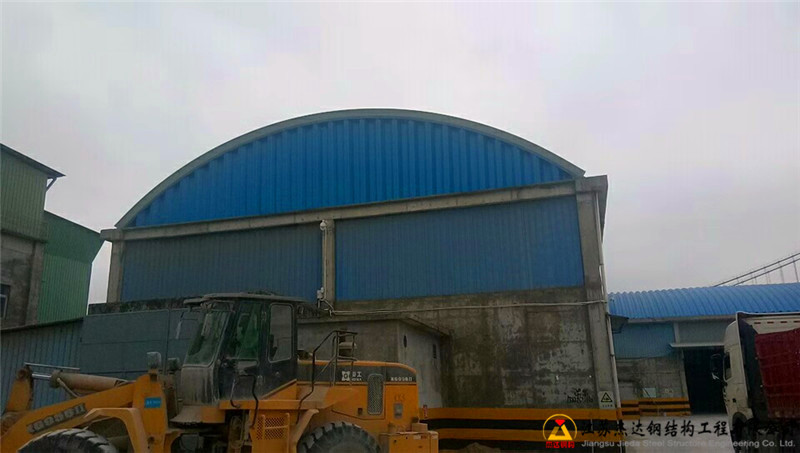 本工程位于廣東省汕頭市海灣大橋下的華潤(rùn)水泥廠內(nèi),拱形屋頂跨度由東向西逐漸變化,最大跨度為21米,最小為14米。屋頂采用寶鋼1.2毫米厚彩鋼卷材,矢跨比約為1/4,拱高約四米。