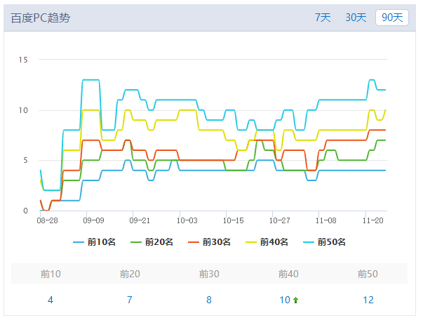 我查看了一下本網(wǎng)站百度PC趨勢90天的趨勢,目前來看從8月28號到11月20號,關(guān)鍵詞的排名陸續(xù)上升,在11月初的時候經(jīng)歷了一段低谷期,現(xiàn)在還算比較穩(wěn)定。
