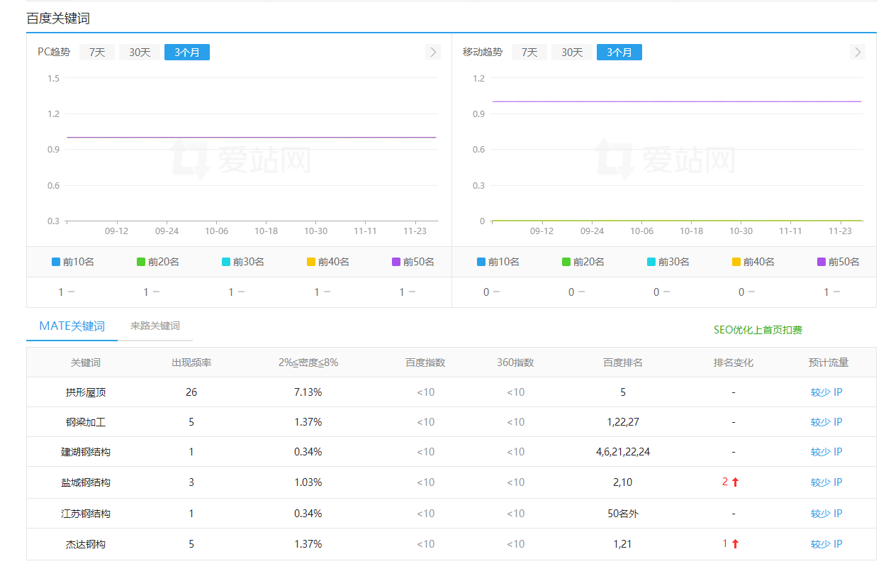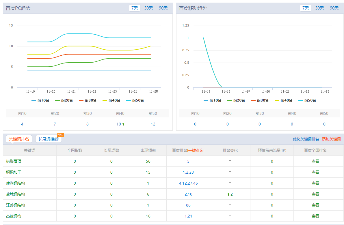 從站長工具上來看,把網(wǎng)站目前PC趨勢在15點左右,其中排在前10頁的關(guān)鍵詞有4個,分別是鹽城鋼結(jié)構(gòu),鋼梁,拱形屋頂與江蘇鋼結(jié)構(gòu)公司。
