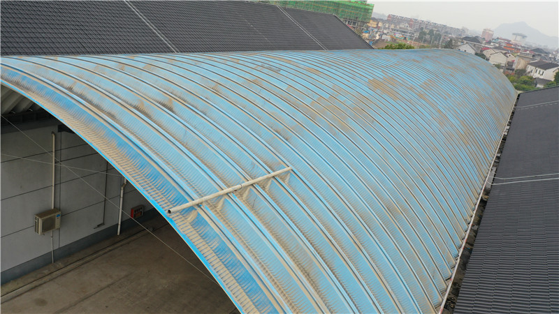 對(duì)比舊有糧庫(kù)拱形屋頂照片可以看出,舊屋頂采用海藍(lán)色板材,而新建罩棚則選用鐵青灰色彩涂板壓制。顏色和材質(zhì)的選擇均考慮了美觀性與實(shí)用性的結(jié)合,滿足了倉(cāng)庫(kù)對(duì)耐久性和防護(hù)性的要求。