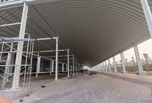 本項(xiàng)目位于重慶市江津區(qū)白沙工業(yè)園,是一項(xiàng)涉及超大跨度彩色金屬拱形屋頂?shù)某隽吓锕こ?,施工周期緊湊,施工管理嚴(yán)格,確保質(zhì)量與進(jìn)度的良好平衡。